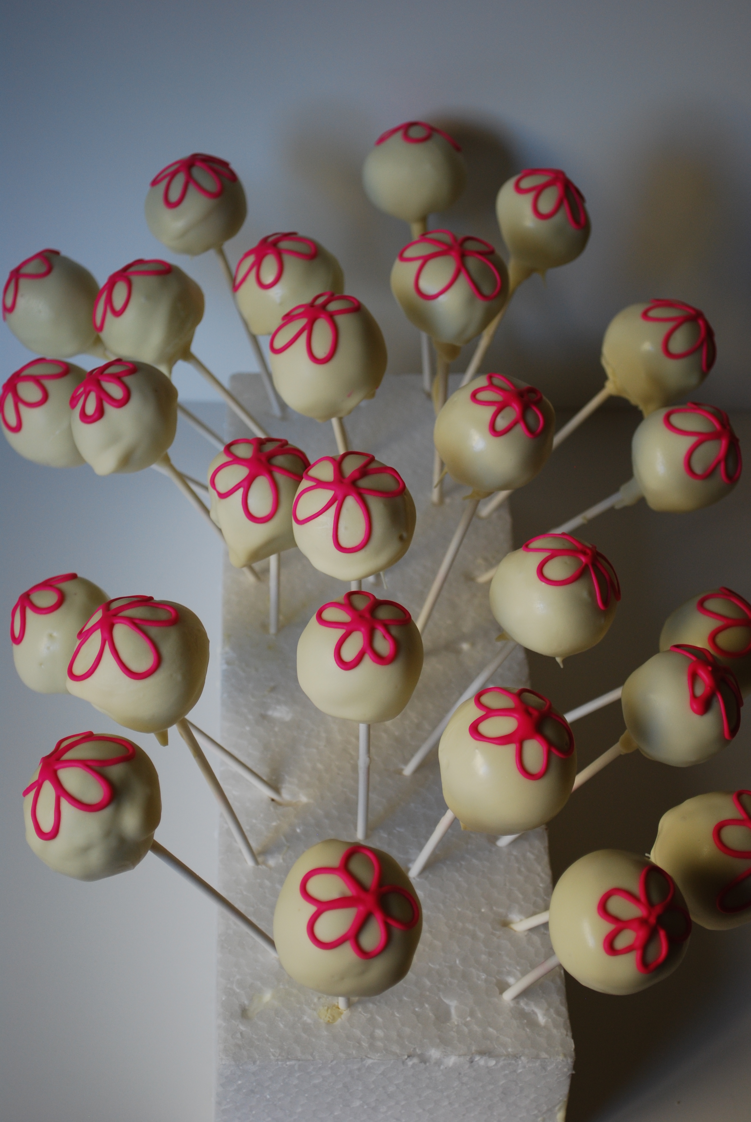 I made two different flavors for the cakes, vanilla and chocolate, with 2 different fillings, ganache with organic strawberries and organic strawberry buttercream. They were covered in fondant. I always try to get as many organic ingredients as possible. I am thrilled to say that this cake was almost entirely organic! I made forty cake pops in two different styles also.